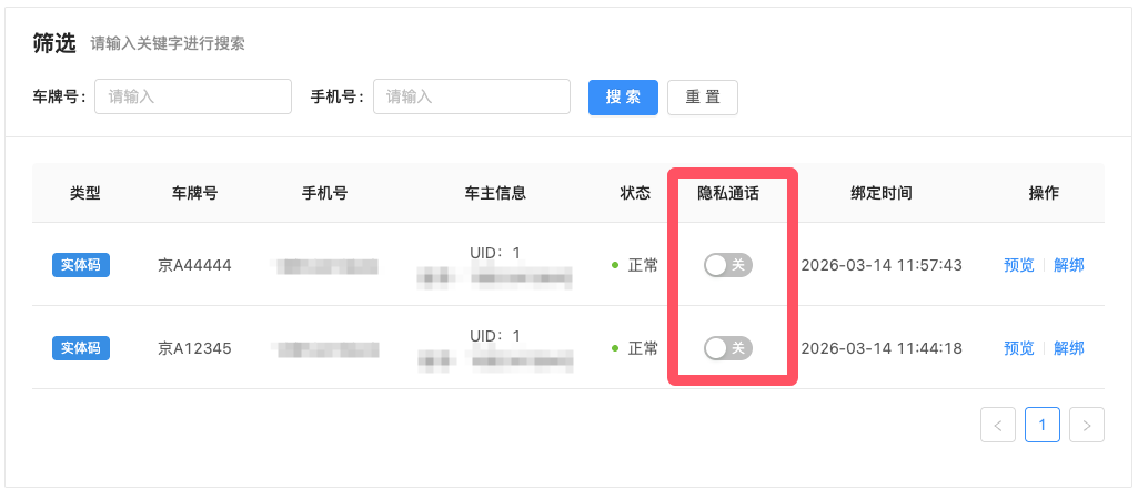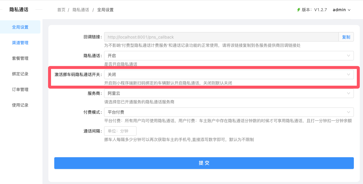 2、后台插件->隐私通话->全局设置中新增“激活挪车码隐私通话开关” 开启则小程序端新扫码绑定的车辆默认开启隐私通话,关闭则小程序端新扫码绑定的车辆默认关闭隐私通话。挪车页面电话联系车主时先判断该车辆是否开启了隐私通话,开启使用隐私号呼出,关闭使用真实号码呼出。